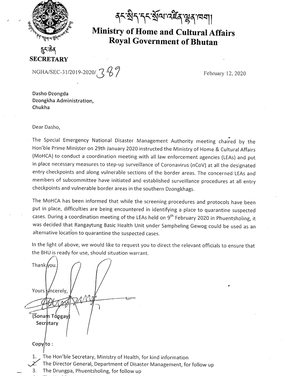 The Special Emergency National Disaster Management Authority meeting chaired by the Honorable Prime Minister on 29th January, 2020 instructed the Ministry of Home & Cultural Affairs (MoHCA) to conduct a coordination meeting with all the law enforcement agencies (LEAs) and put in place necessary measures to step-up surveillance of Corona-virus (nCoV) at all the designated entry checkpoints and along vulnerable sections of the border areas.